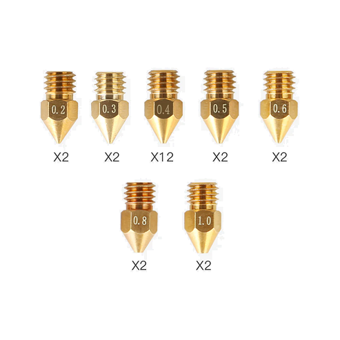 - این بسته شامل ۱۲ عدد نازل سایز ۰.۴ و دو عدد از هرکدام از سایزهای ۰.۲، ۰.۳، ۰.۵، ۰.۶، ۰.۸ و ۱.۰ میلیمتر میباشد.